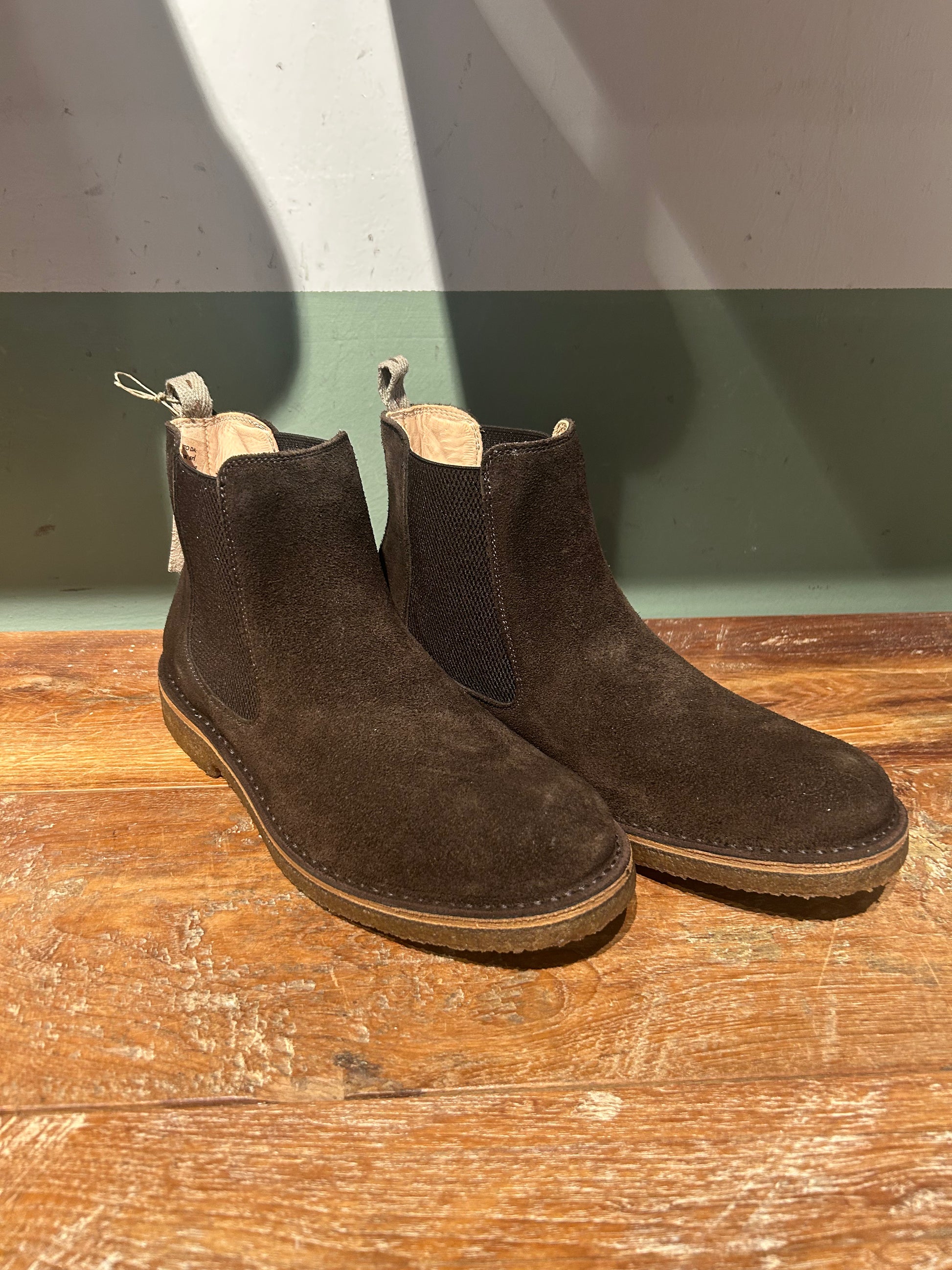 Polacchino realizzato in pellame scamosciato. Soletta interna in pelle di vitello conciata al vegetale. La suola è realizzata in para, una resina naturale ottenuta dalle piante. Lavorazione artigianale “Ideal”.