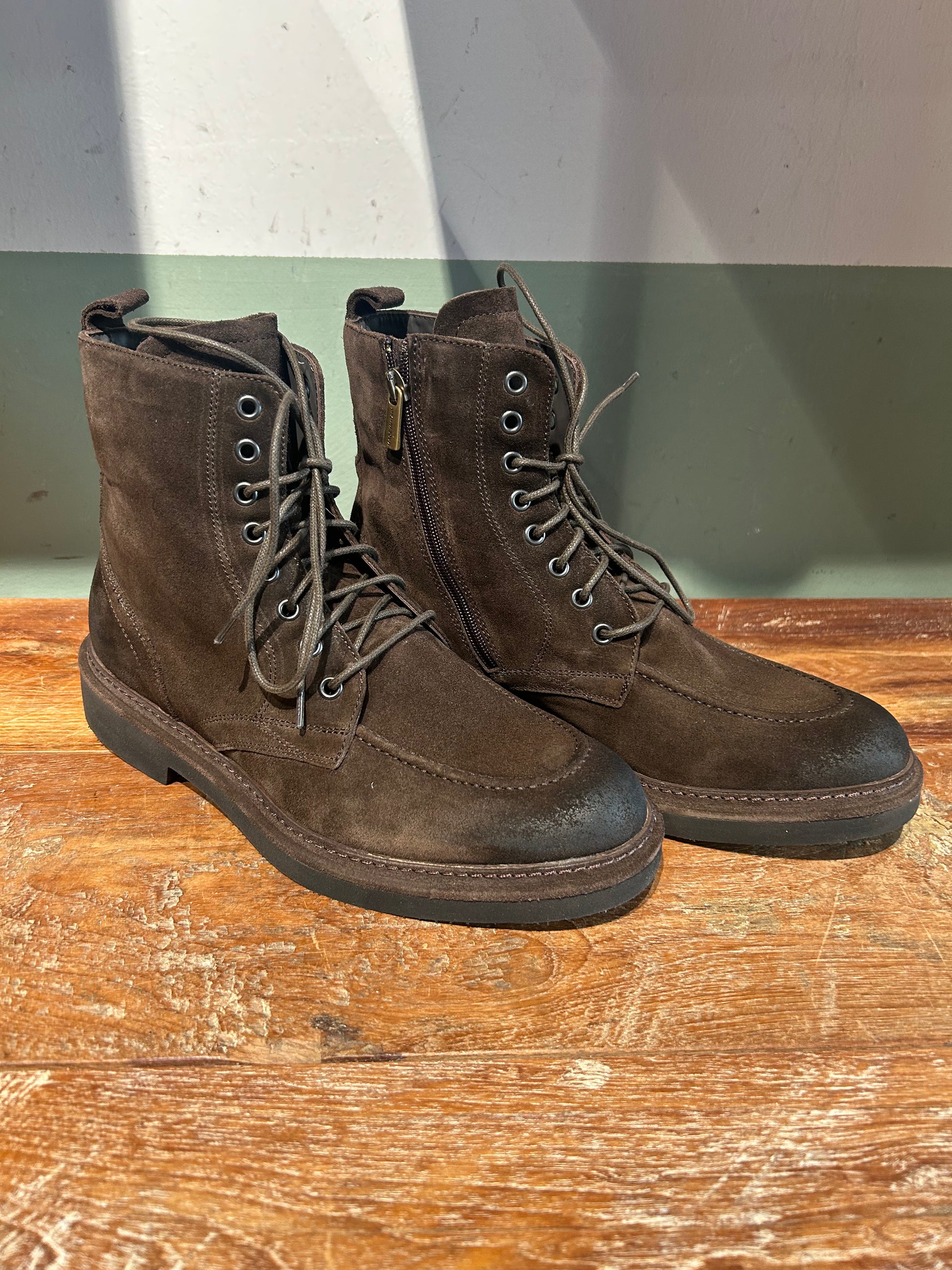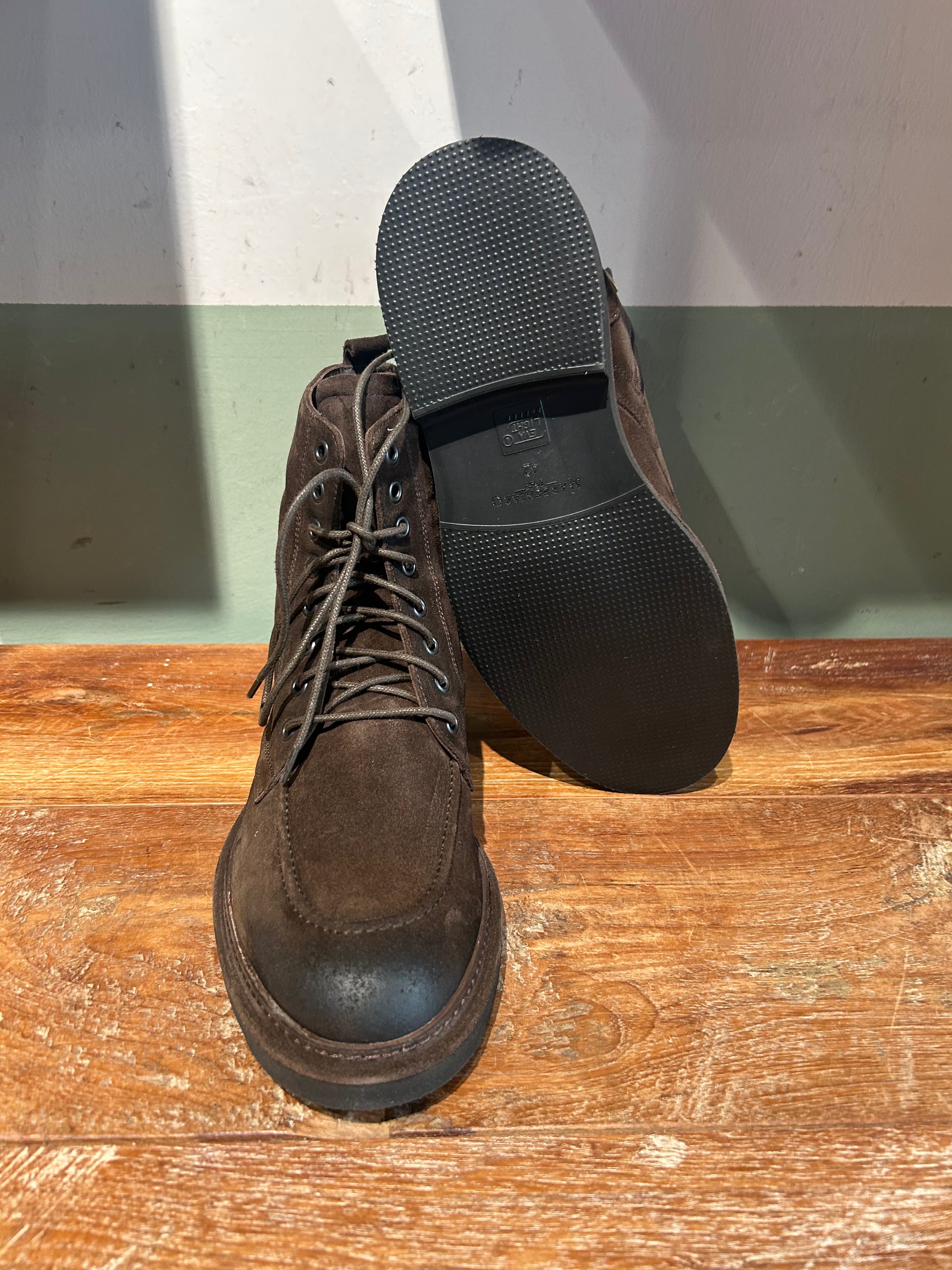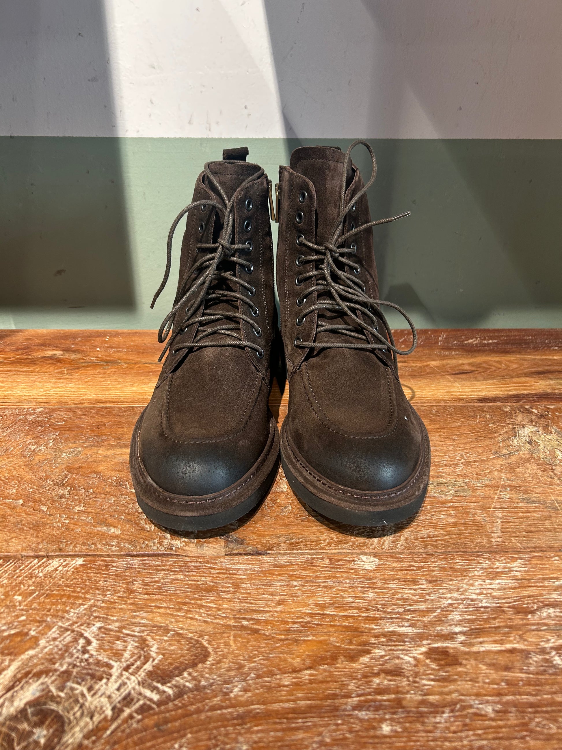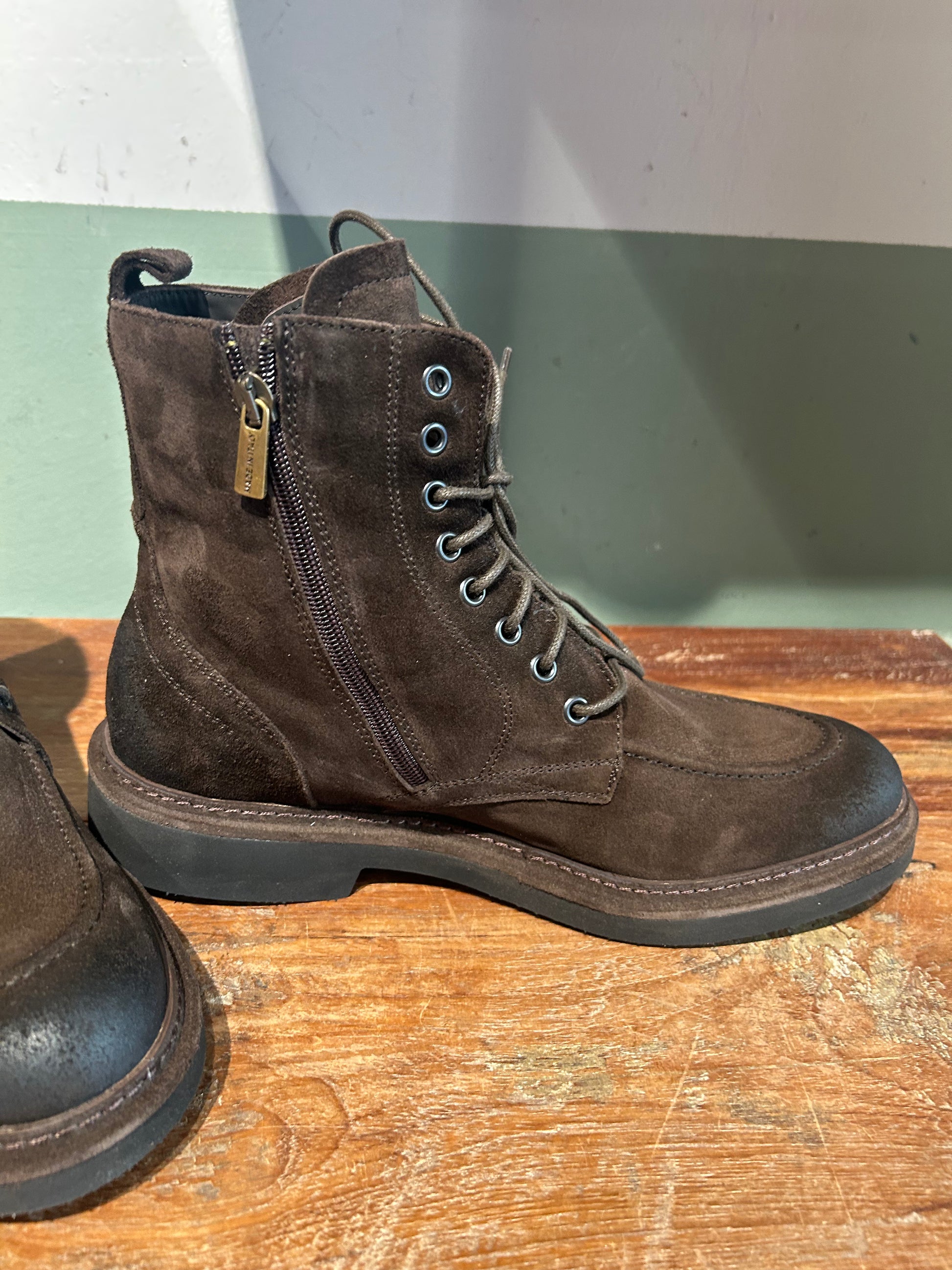 Polacca con fondo gomma Eva molto leggera e morbida , tomaia in camoscio invecchiato e cerniera laterale per una calzata immediata